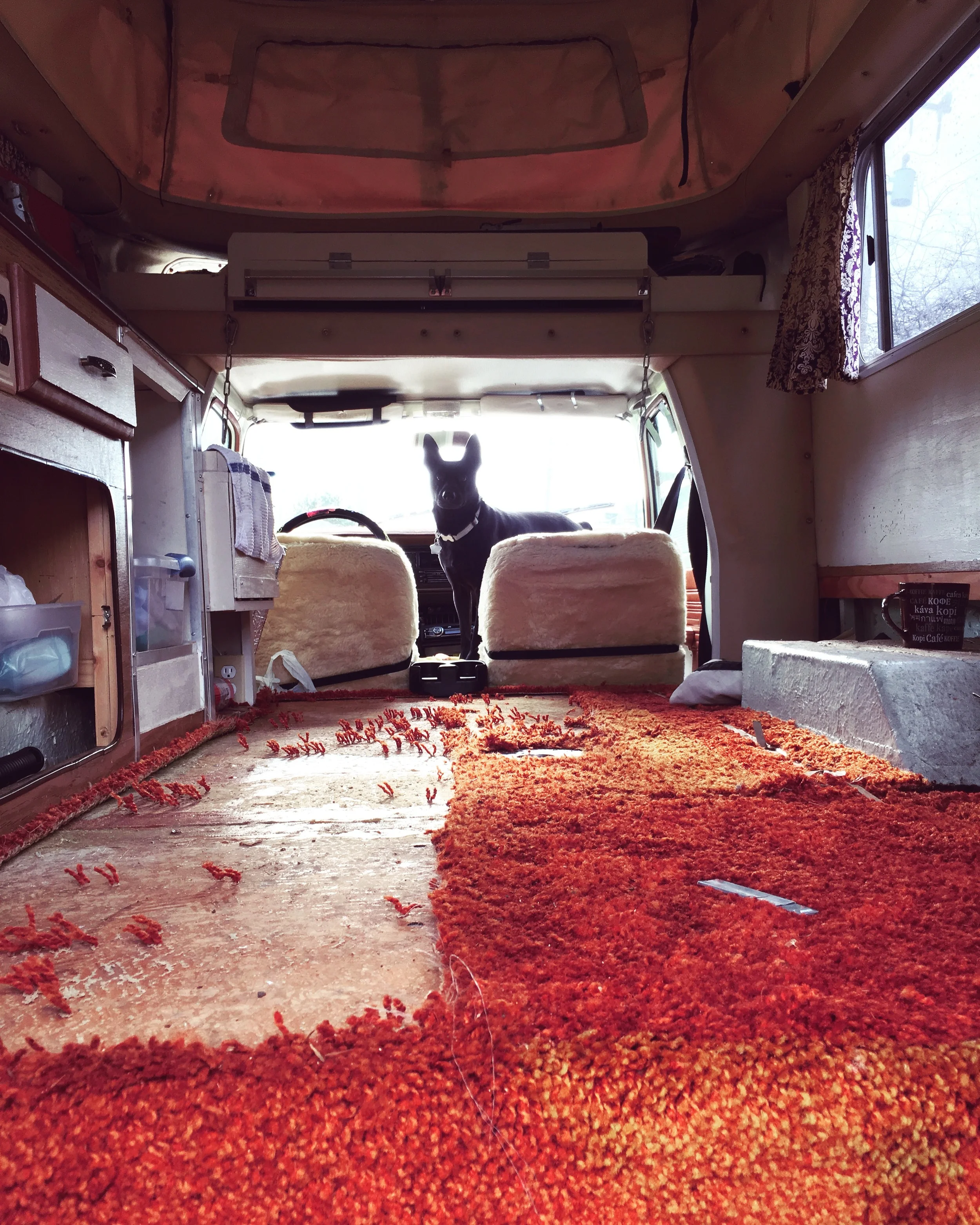 And the shag, oh the shag! Simultaneously glorious and revolting, classic seventies, with long red-orange fibers, like an army of cancerous sea anemones refusing to surrender. This “wall to wall” rug was protected by clear plastic floor covering of the type you’d have found under a nineties rolling office chair. What was hiding in that ancient shag? Would I be able to keep it clean and dry, living in the little truck full time with my dog? We’d be outside running and hiking daily, and in such a small space keeping a rug clean seemed an impossible task.